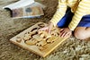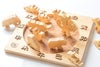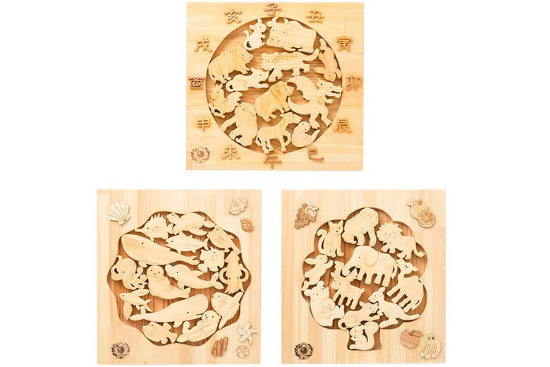 陸の動物11種類のピースが入った〈陸パズル〉、海の生き物15種類のピースが入った〈海パズル〉、干支12種類のピースが入った〈十二支パズル〉をセットにしました。パズル遊びだけでなく、バランスよく積み上げたり、ごっこ遊びなど色んな遊びが楽しめます。重ねてすっきりお片付け。長く遊べるパズルセットです。