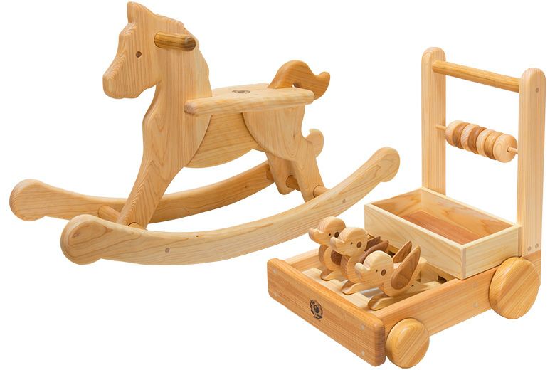 どちらも高知県産の上質なヒノキやサクラ、ケヤキを使用し、職人が一つ一つ丁寧に作り上げています。赤ちゃんが舐めても安心な植物性オイル仕上げ。自然素材ならではの温かみが魅力の、世代を超えて愛される逸品です。