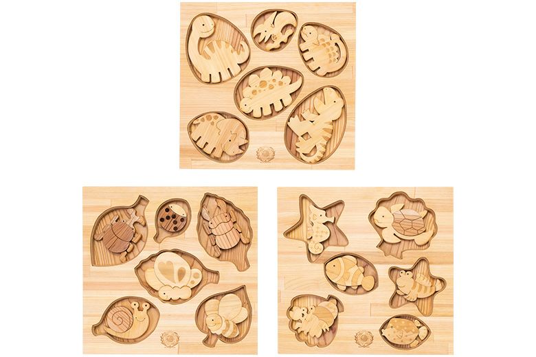 大き目ピースで小さなお子様も遊びやすいかくれんぼパズル3種をセットにしました。たまごの下に表情豊かな恐竜たちがかくれた〈きょうりゅう〉、葉っぱの下にカブト虫やてんとう虫がかくれた〈さとやま〉、貝やヒトデの下にウミガメやヤドカリがかくれた〈うみべ〉。重ねてすっきりお片付けができます。【グッド・トイ2022/林野庁長官賞】
