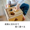 丸、三角、四角という形を認識する為の、1~3歳頃に遊べる知育玩具です。箱のふたの上や横から形を合わせた積み木を入れて遊ぶことで、片付ける作業を覚えることもできます。