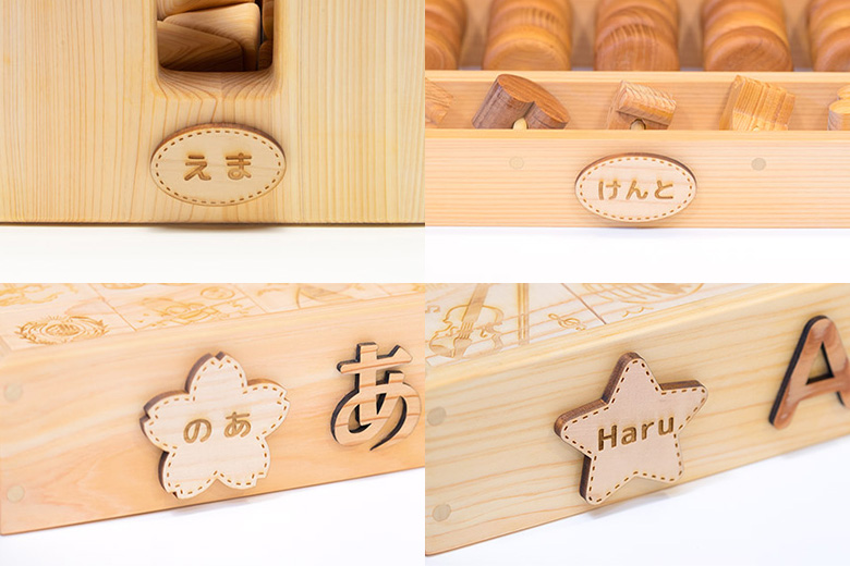 6面キューブにイラストやひらがな刻印された〈あいうえおつみき〉、