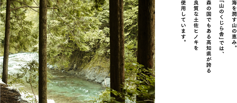 高知県は日本の中でも日射量や雨量が多く、南の国に近い気候でもあります。そのなかでも四国山脈に囲まれた清流・四万十川や吉野川の源流域は、温暖な地域でありながら寒暖差が大きく、台風や大雨が多い地域でも知られています。この、時には厳しい気候が木に強度を、そして豊富な油脂分を与えるのです。熱に強く、耐水性や耐久性に優れ、殺菌効果も高いことから、古くは神社仏閣の建築にも多く用いられてきました。